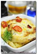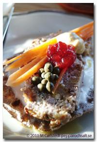 Gör så här:Strimla salamin. Skala potatisen och skär den i centimeterstora tärningar. Koka dem knappt mjuka i lättsaltat vatten, cirka 5 minuter. Hetta upp smöret i en stor stekpanna och stek därefter potatisen på medelhög värme tills den fått fin färg runt om. Tillsätt salami och lök mot slutet. Gör omelettsmeten medan potatisen ligger i pannan. Vispa äggen tillsammans med vatten, salt, svartpeppar och timjan. Häll smeten över potatisen, salamin och löken. Sänk värmen och låt omeletten stanna på ovansidan.